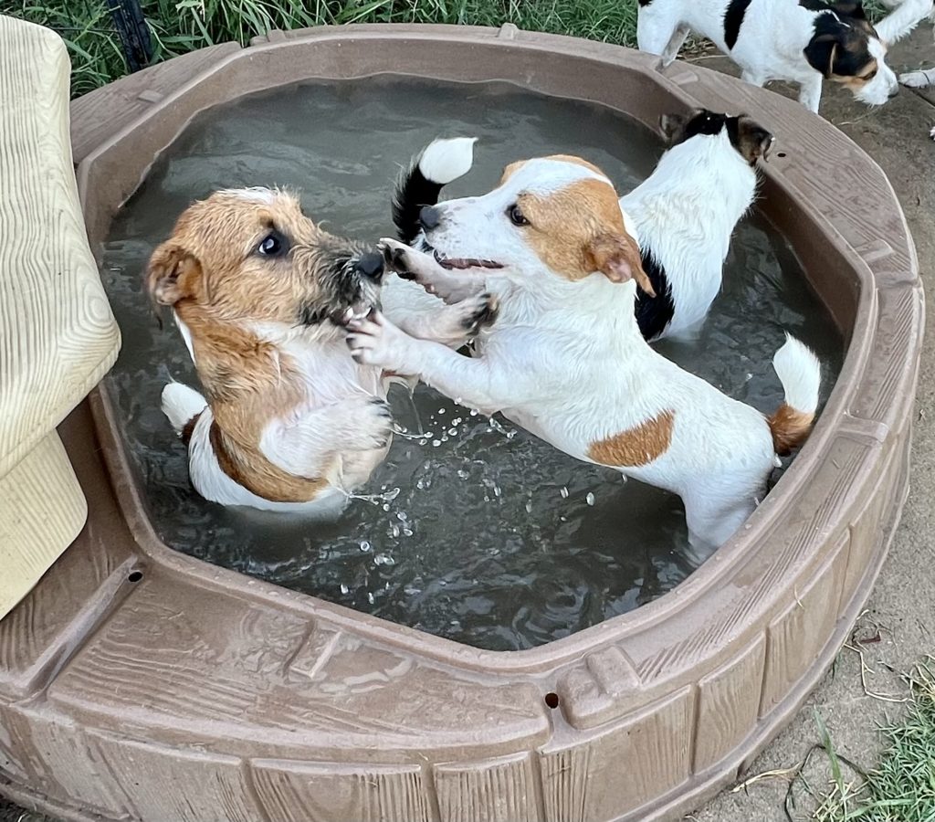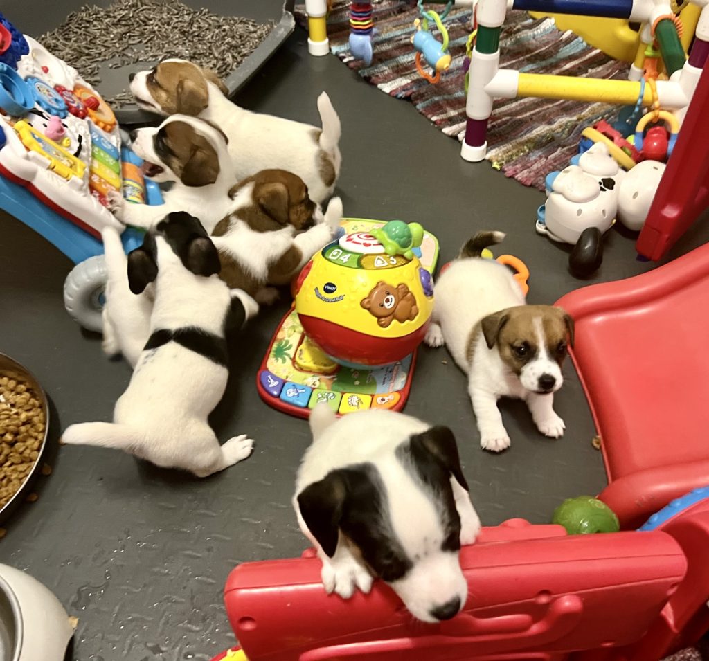 My little ones are also well socialized with our grandchildren when they visit and all day with us. When they are old enough they play with all my age appropriate Jacks. My puppies will use a litter box, and also know how to use a doggie door. At the age of 6 weeks I will start working on a few commands such as “sit and come”. They are so smart and learn very fast!